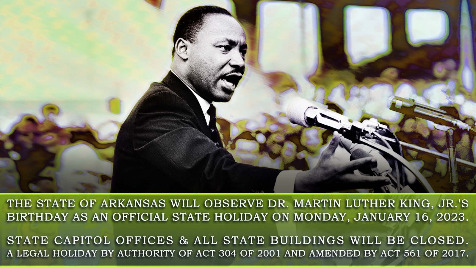 The State Capitol Offices and all State Buildings will be closed on Monday, January 16, 2023, for the observed birthday of Dr. Martin Luther King, Jr.