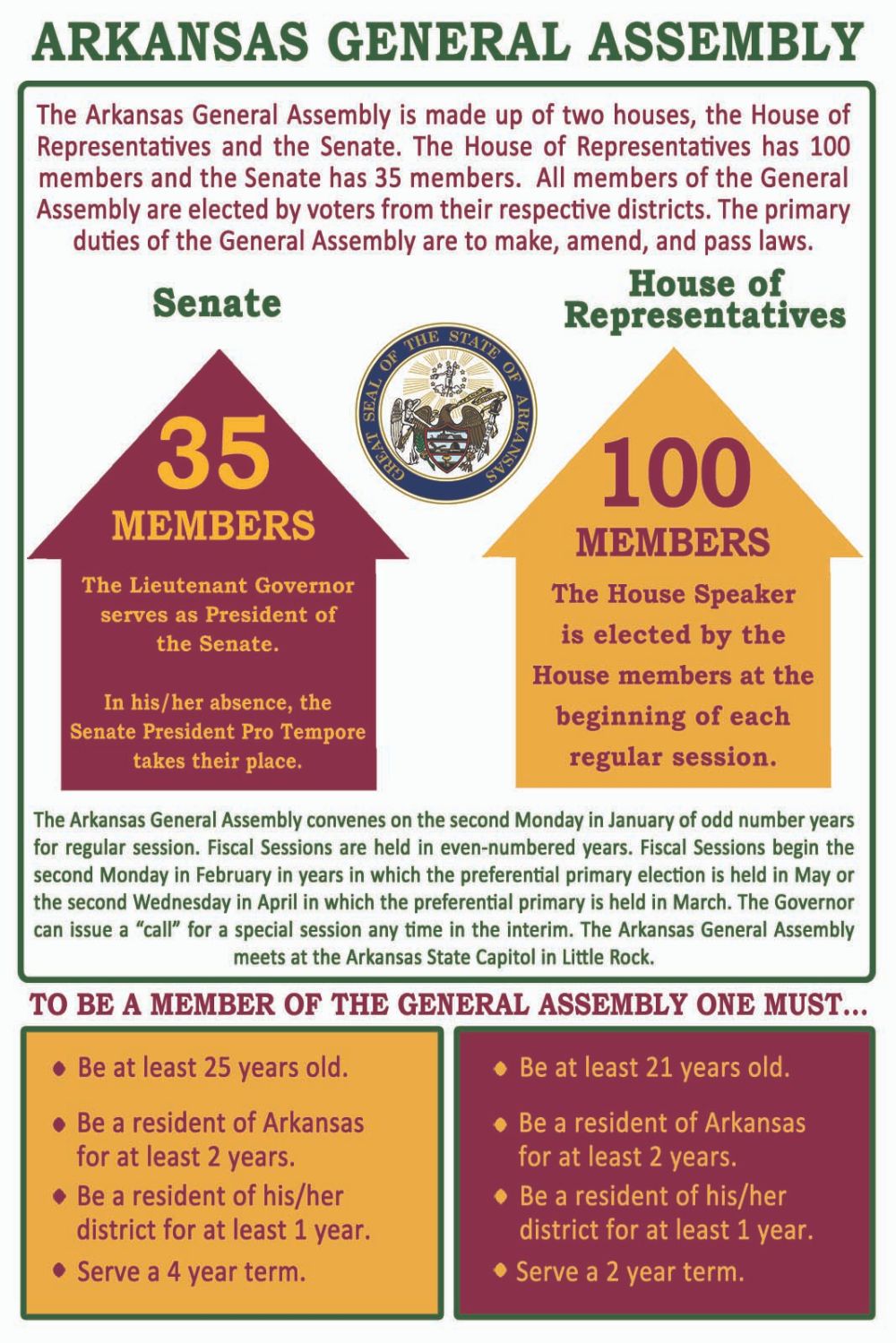 ViewThe Arkansas General Assembly is made up of two houses, the House of Representatives (100 members) and the Senate (35 members).
