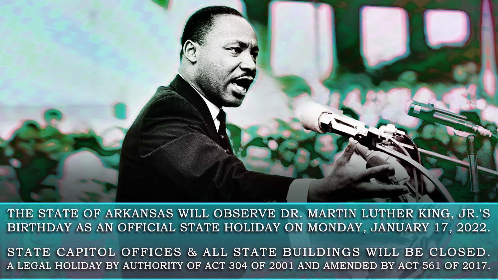 The State Capitol Offices and all State Buildings will be closed on Monday, January 17, 2022, for the observed birthday of Dr. Martin Luther King, Jr.