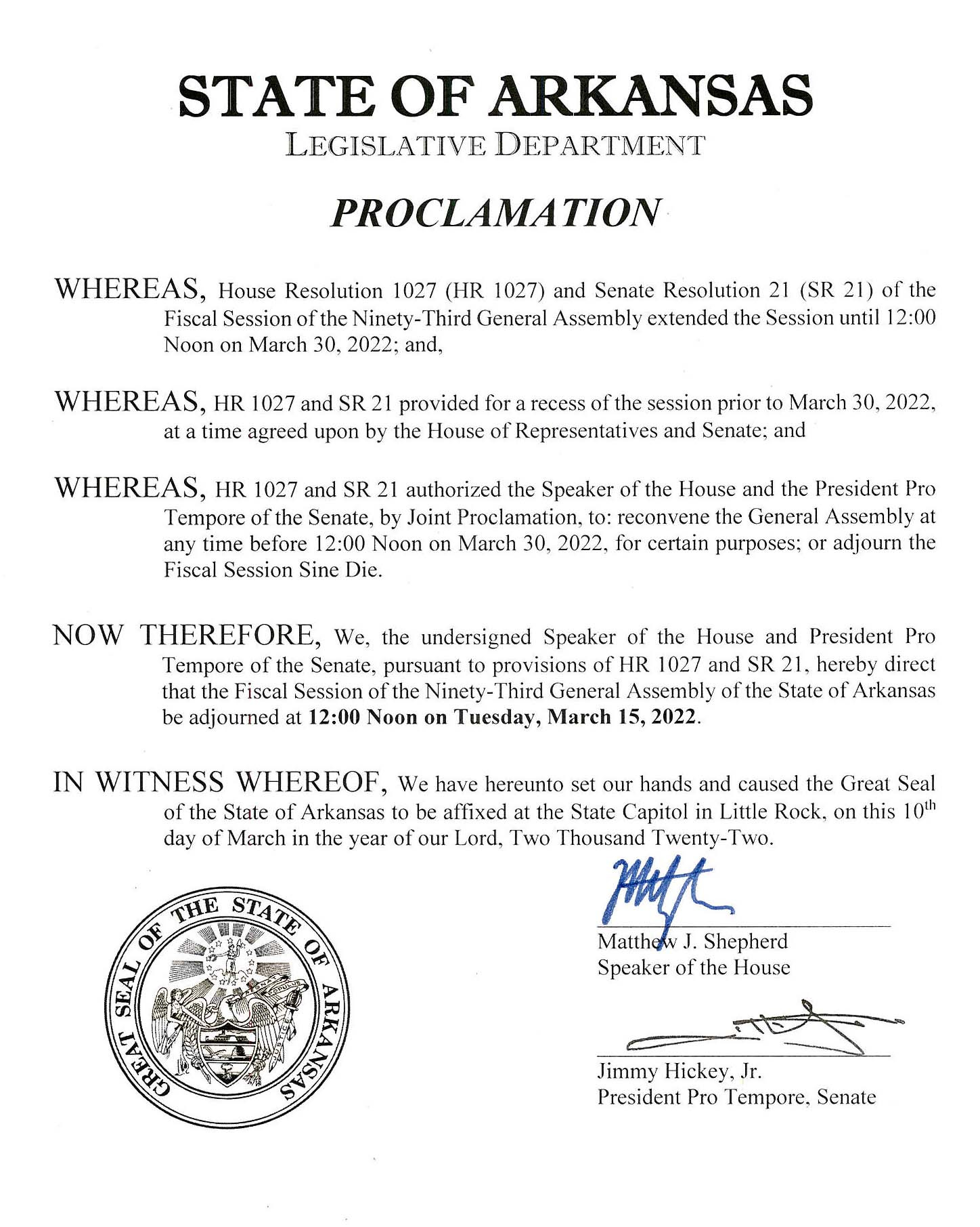 Speaker Shepherd and Senator Hickey have issued the proclamation below which calls for the Fiscal Session of the 93rd General Assembly to automatically adjourn sine die at noon on Tuesday, March 15, 2022.