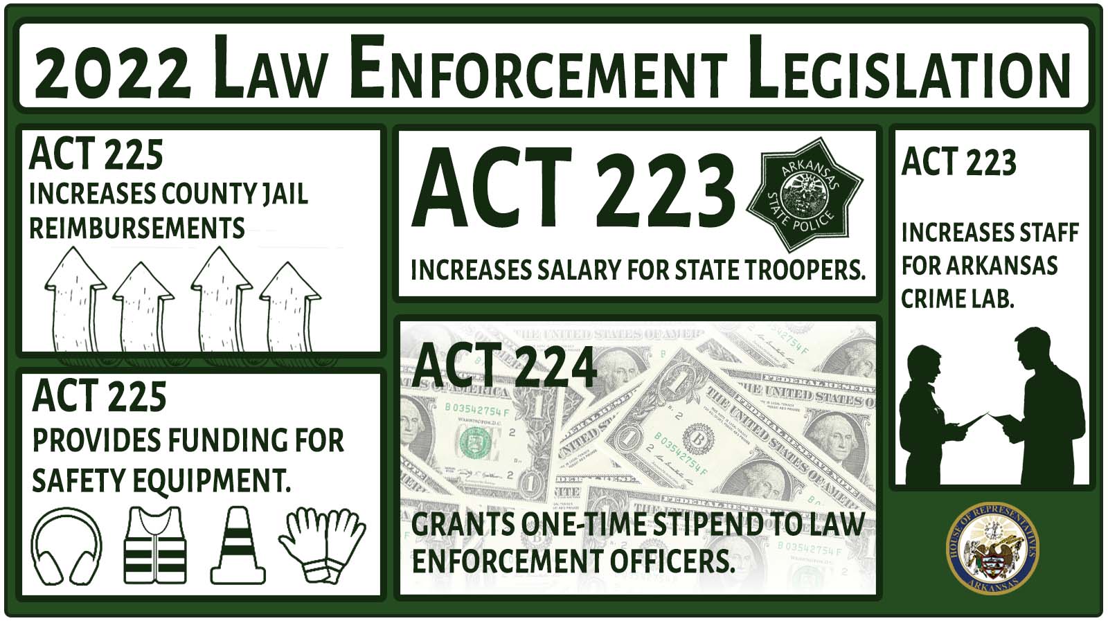 Act 225 which outlines the budget for Fiscal Year 2023 funds an increase for county jail reimbursement from $32 per day to $40 per day and provides $10 million for body cameras, bullet-proof vests, and other law-enforcement safety equipment.