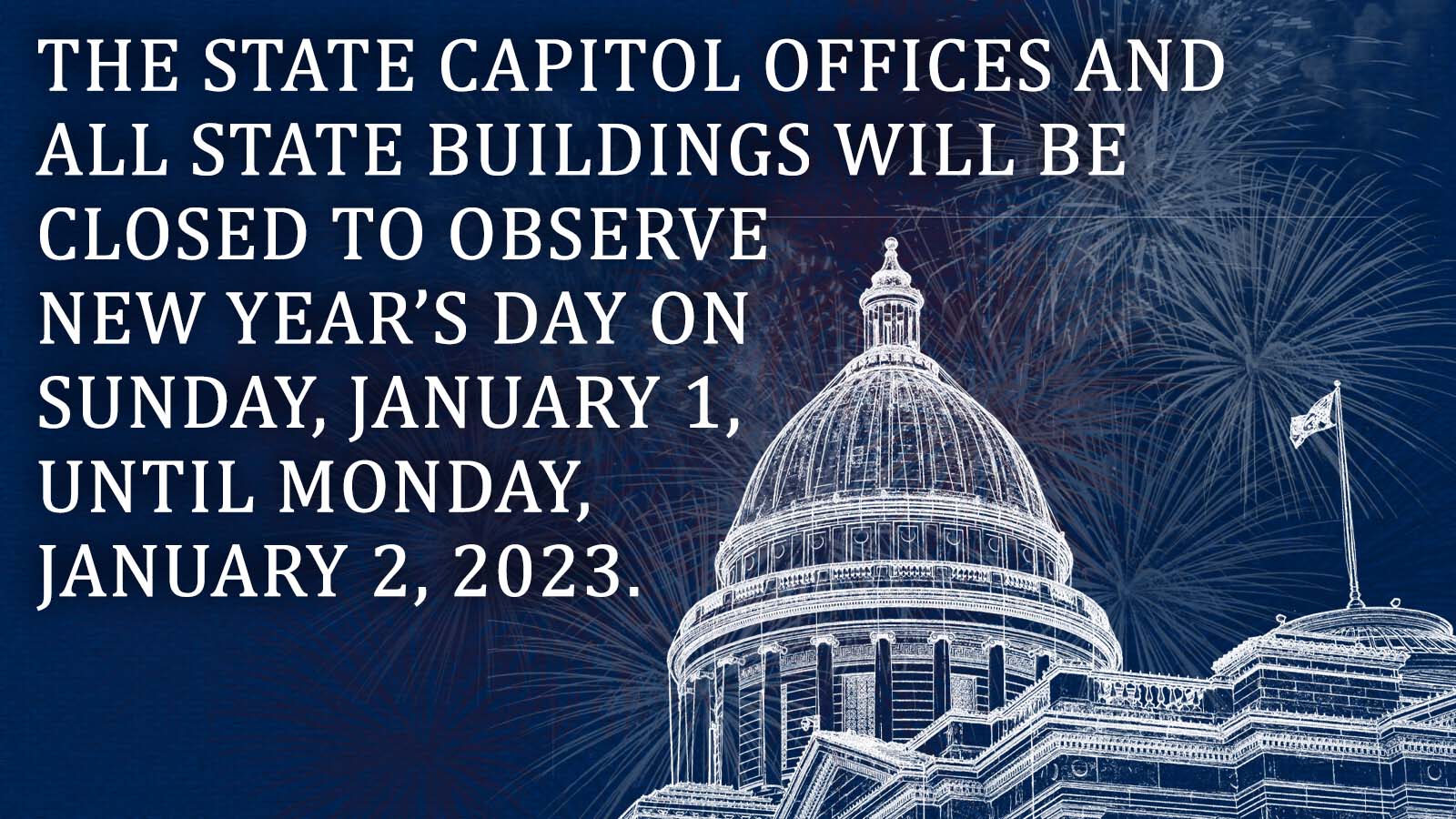 The State Capitol Offices and all State Buildings will be Closed to observe New Year’s Day from Sunday, January 1, until Monday, January 2, 2023.