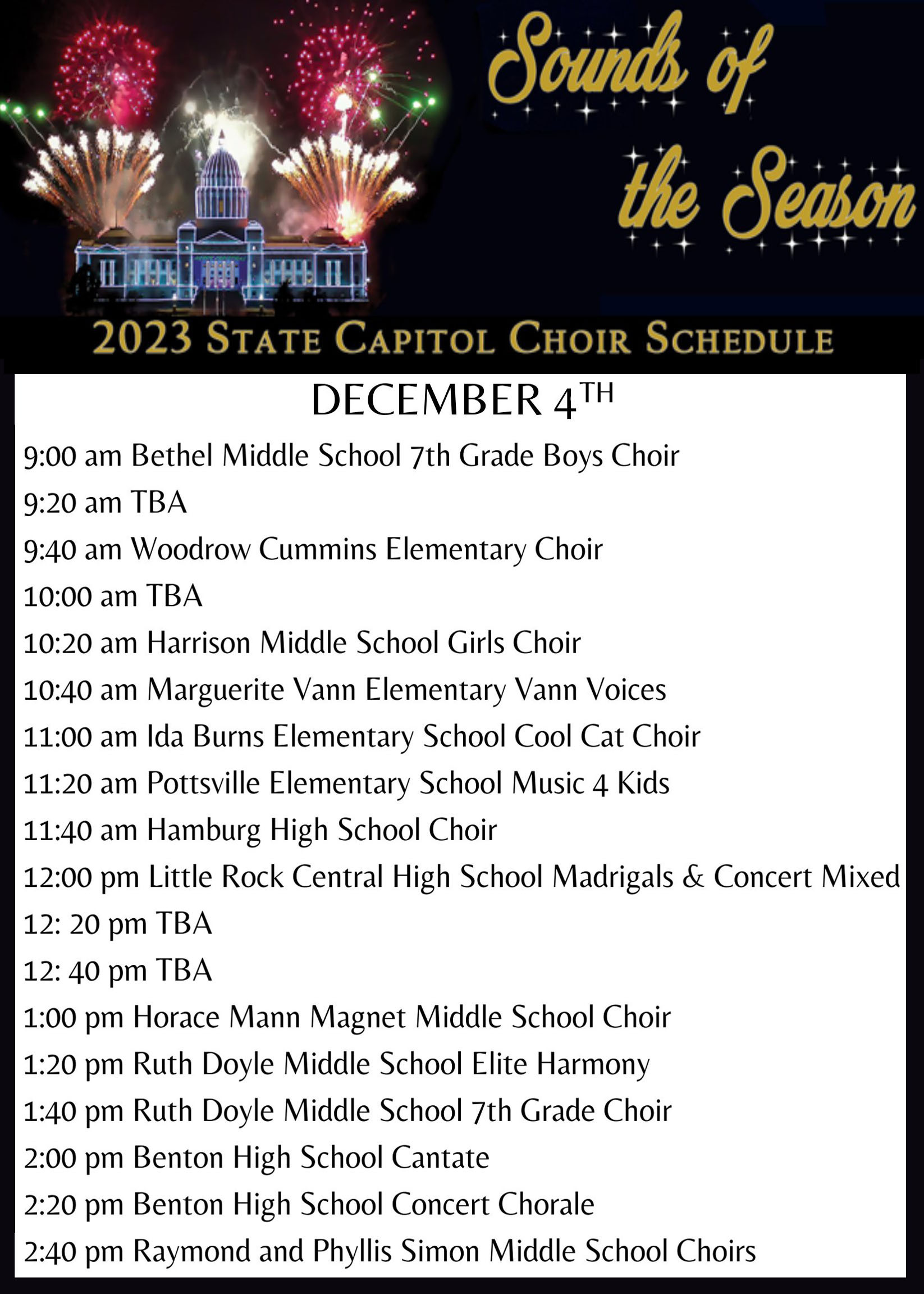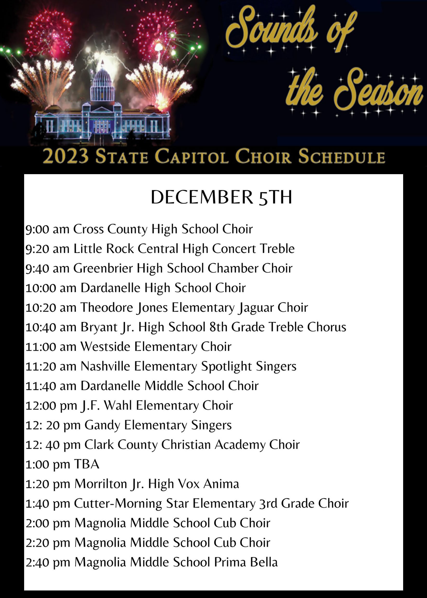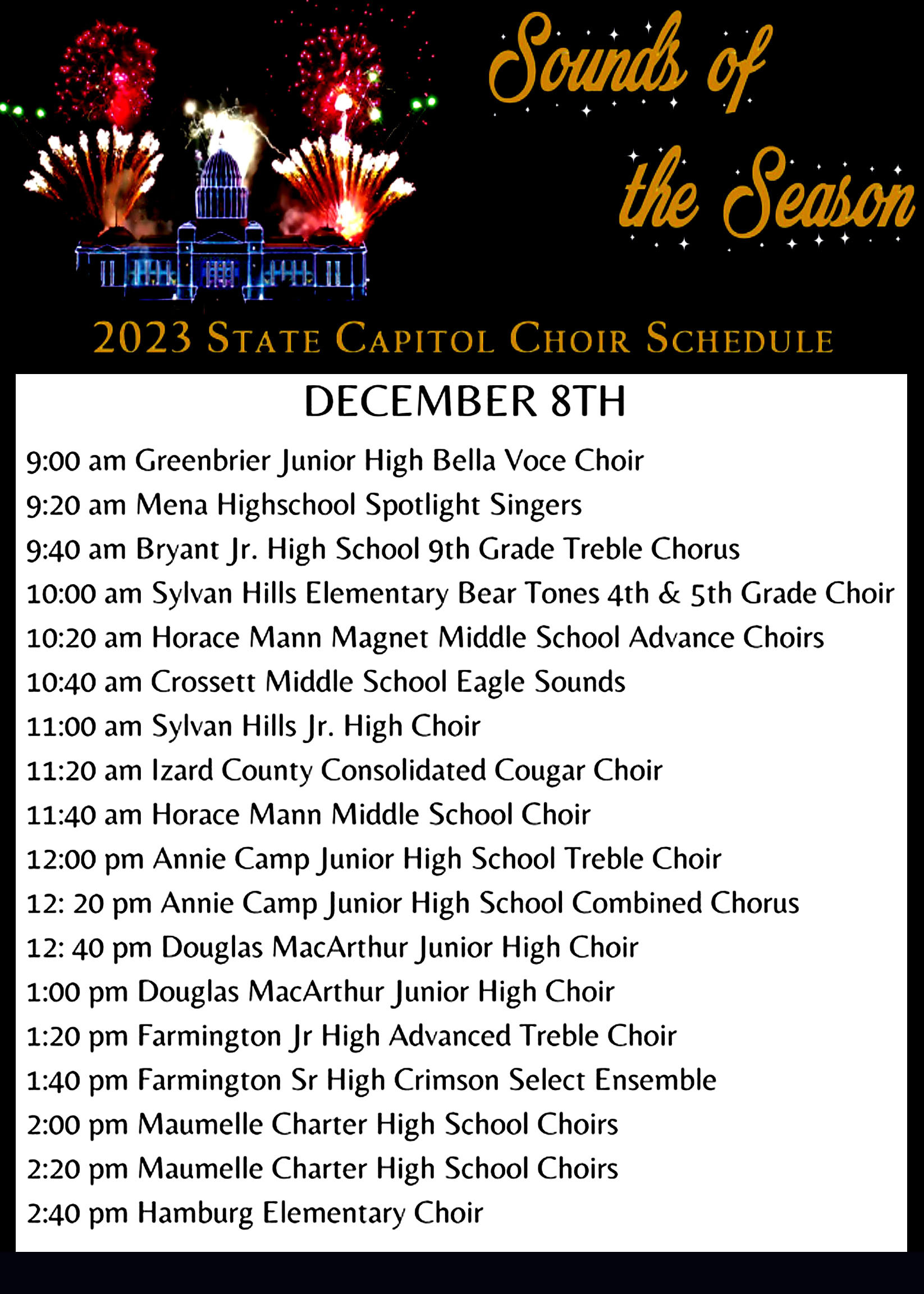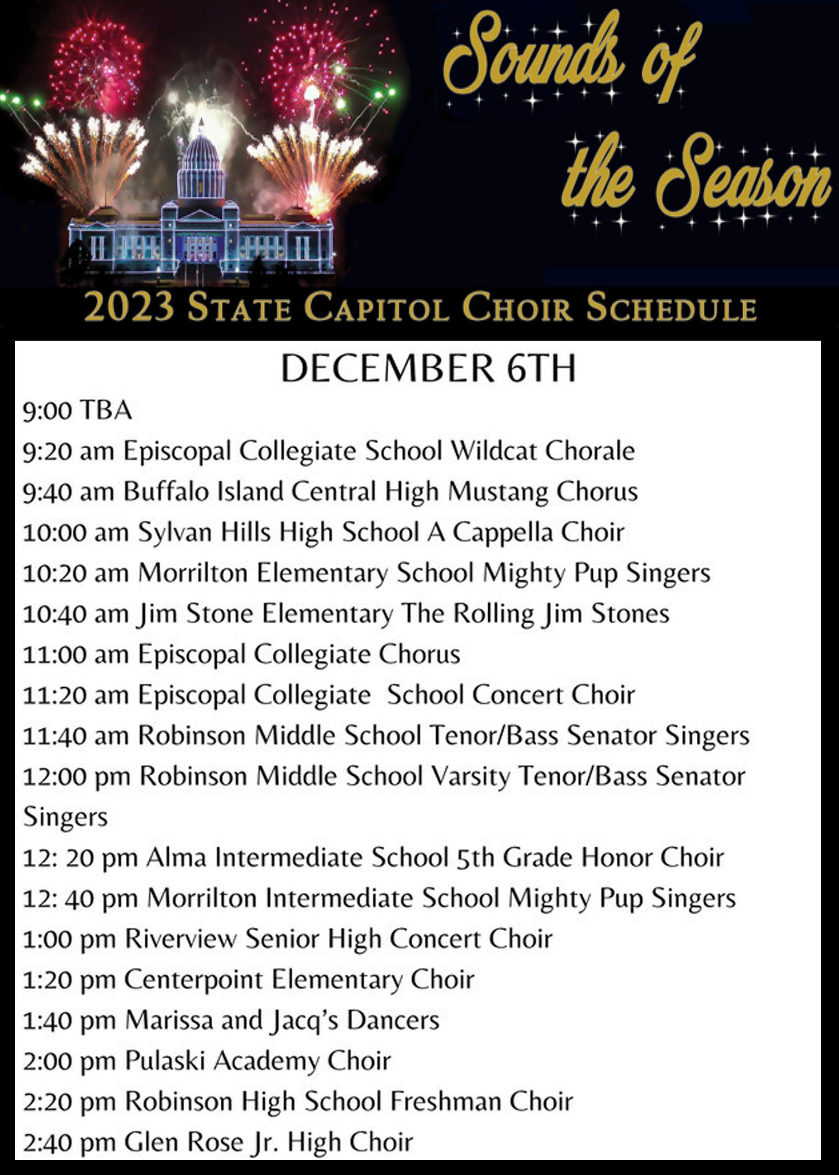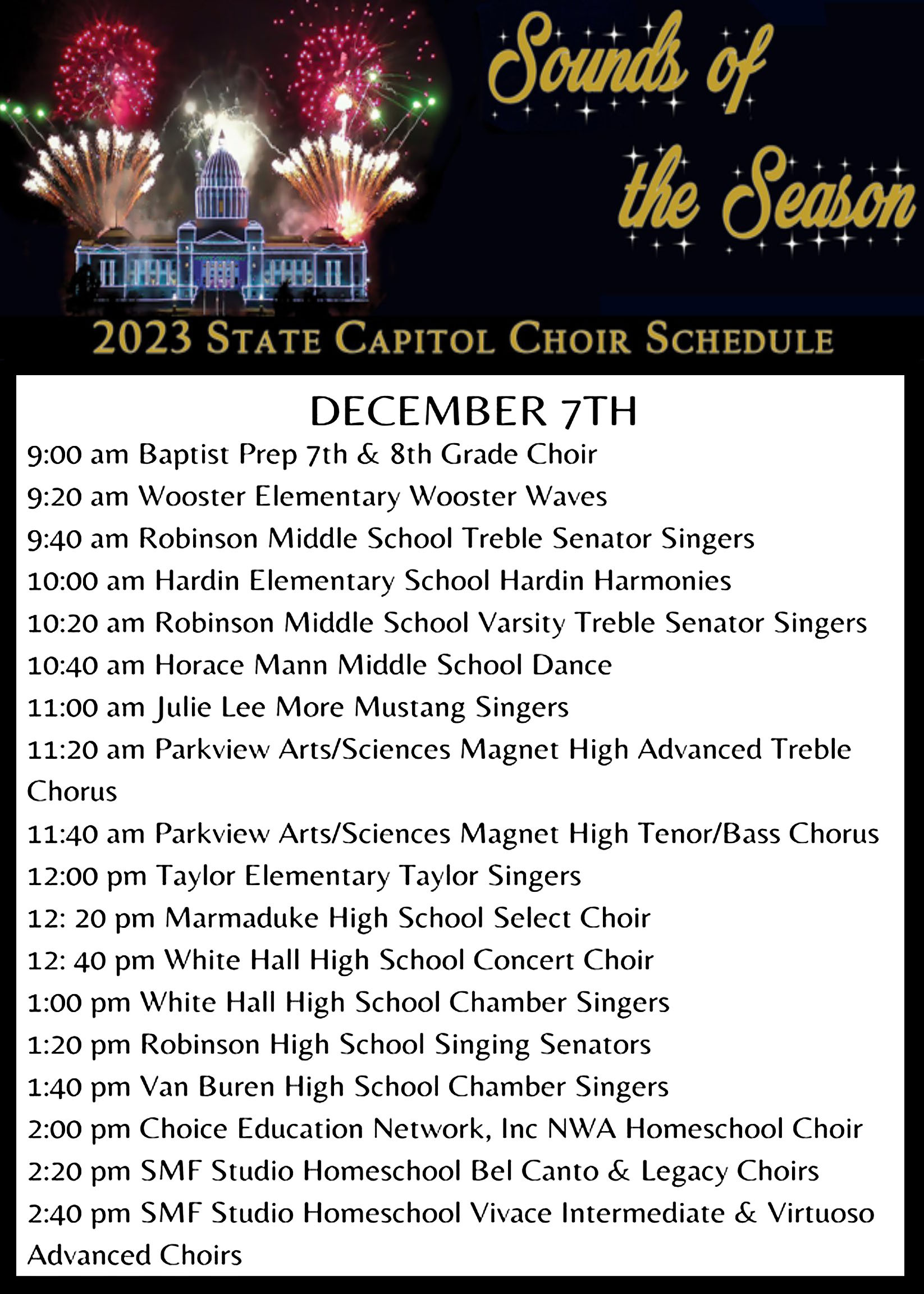 We are currently celebrating 2023 Sounds of the Season performances, where choirs and groups from all over the state of Arkansas come to perform in the Capitol's 2nd Floor Rotunda.