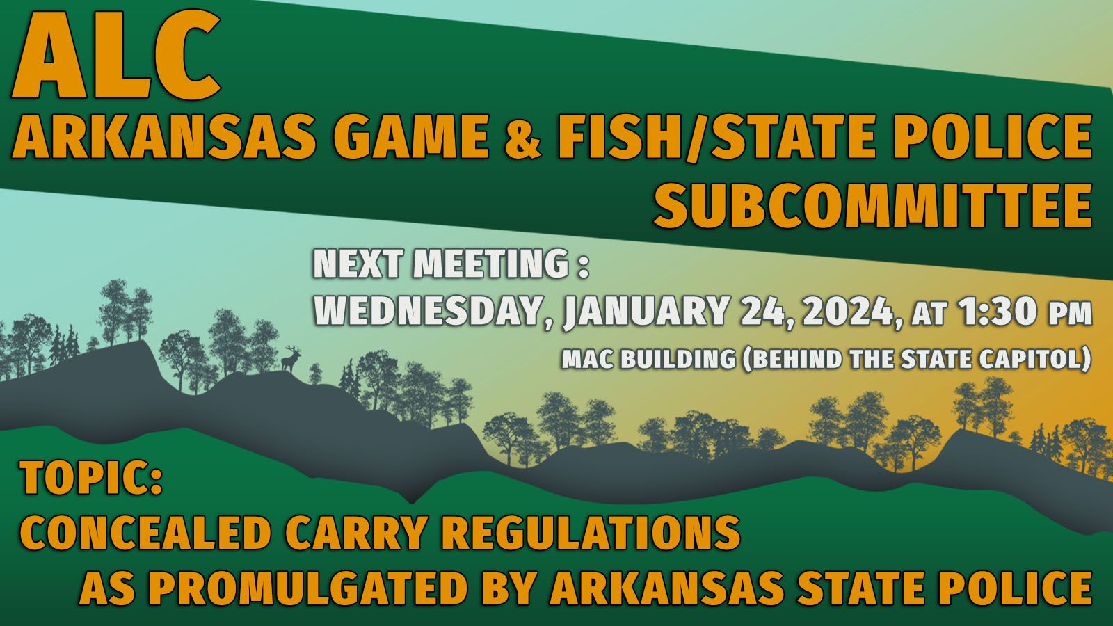 The next meeting of the Arkansas Game and Fish/State Police Subcommittee will be held on Wednesday, January 24 at 1:30 p.m. in the MAC building located behind the State Capitol. The January 24 meeting will specifically address concealed carry regulations as promulgated by Arkansas State Police.