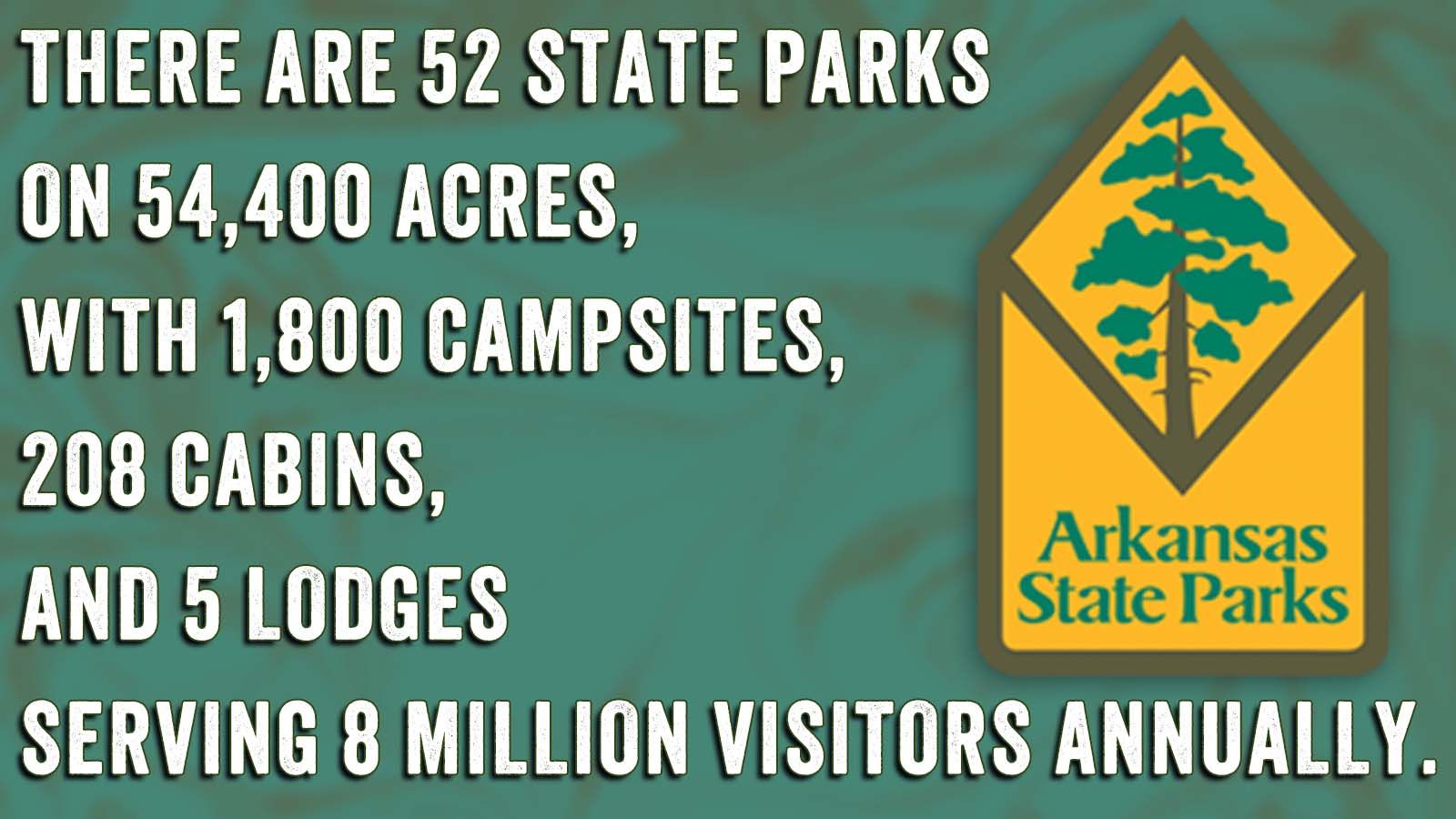 We invite you to celebrate this month by visiting one of Arkansas’s 52 state parks. The parks include about 55,000 acres with 1,800 campsites, 208 cabins, and 5 lodges serving more than 8 million visitors annually.