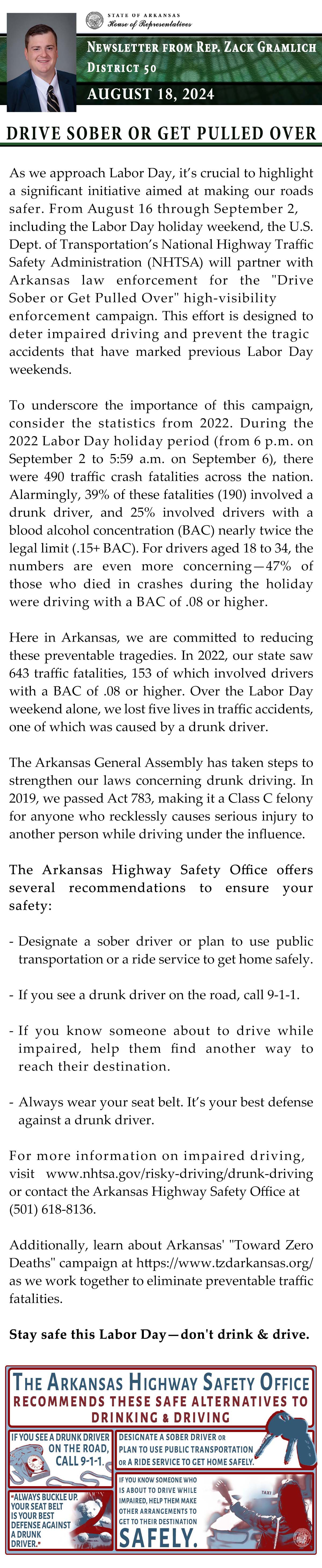 The Arkansas General Assembly has taken steps to strengthen our laws concerning drunk driving. In 2019, we passed Act 783, making it a Class C felony for anyone who recklessly causes serious injury to another person while driving under the influence.