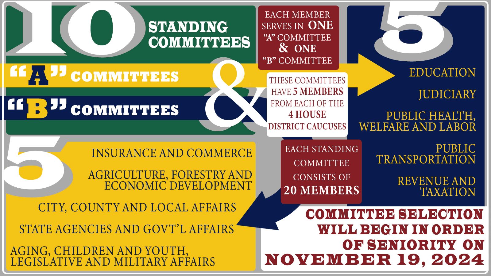 Pursuant to House Rules, the most senior member of the House of Representatives will select first and will choose a position on a Class “A” standing committee. The seniority rotation procedure will continue until the member with the least seniority makes his or her selection. After the member with the least seniority makes his or her Class “A” standing committee selection, the most senior member will select his or her Class “B” standing committee. The seniority rotation will continue until the member with the least seniority selects his or her Class “B” standing committee.