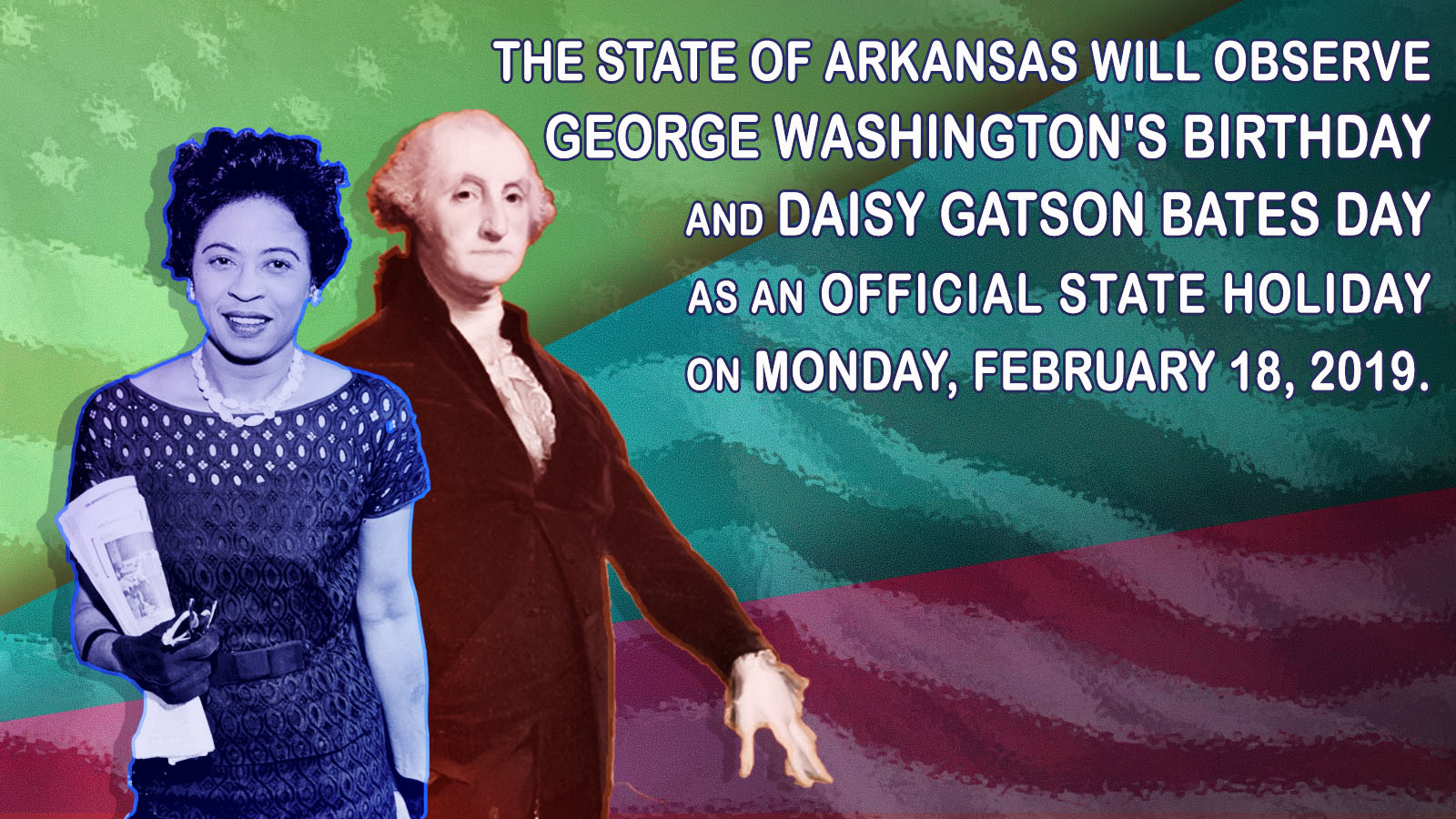 The State of Arkansas will observe George Washington's Birthday and Daisy Gatson Bates Day as an official state holiday on Monday, February 18, 2019.