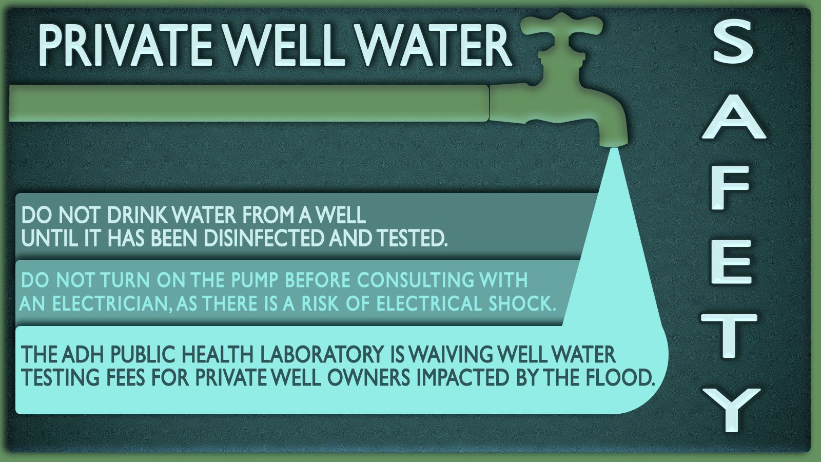 The Arkansas Department of Health announced that the ADH Laboratory is waiving well water testing fees for private well owners impacted by the flood. The department reminds Arkansans that you should not drink from the well until it has been disinfected and tested. You can contact your local health unit for information about testing.
