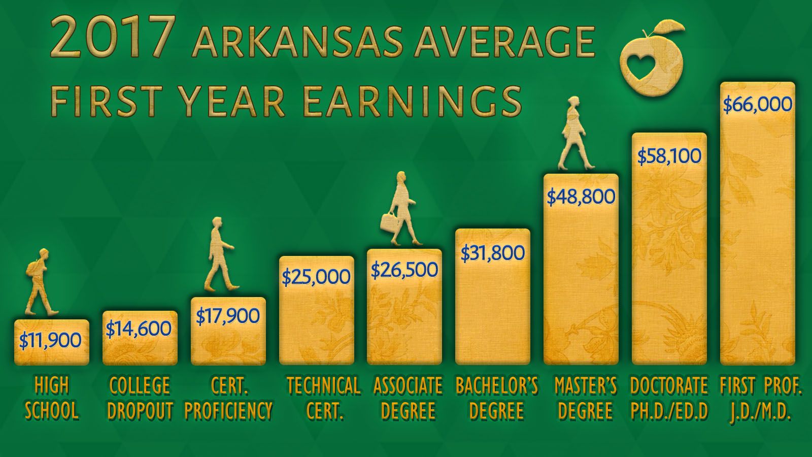On average, an Arkansan with a bachelor’s degree will earn $700,000 more in a 30 year career than those who drop out of college. The gap climbs to $1.5 million for those with a doctorate.