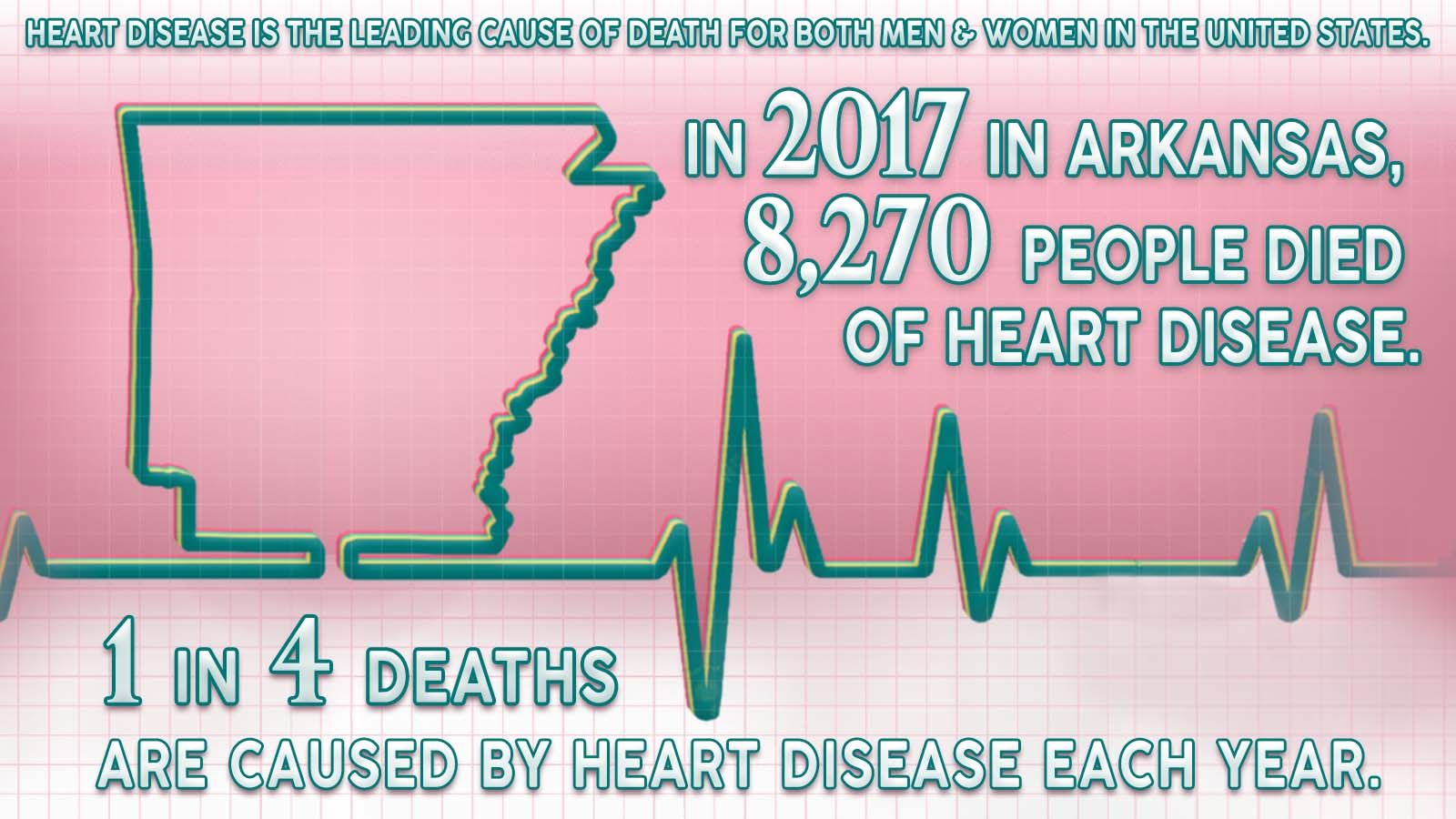 Heart disease is the leading cause of death for both men and women in the United States, and 1 in 4 deaths are caused by heart disease each year. In 2017 in Arkansas, a total of 8,270 people died of heart disease.