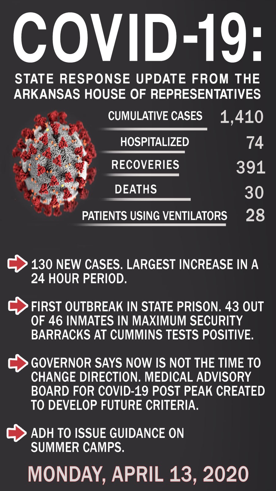 - The numbers released today show the largest increase of positive tests in a 24 hour period for Arkansas. There are 130 new cases reported.