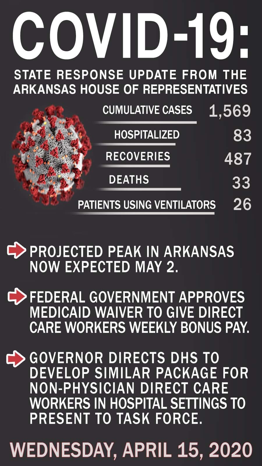 Governor Hutchinson has also directed that DHS develop a similar care continuity payment package for non-physician direct care workers in hospital settings that can be presented to the state task force overseeing COVID-19- specific funding that the state will receive.