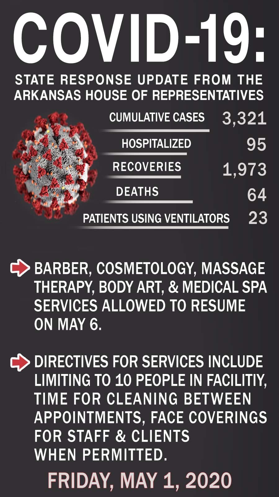 The Governor announced today that barber, cosmetology, massage therapy, body art, and medical spa services will be allowed to resume on May 6.
