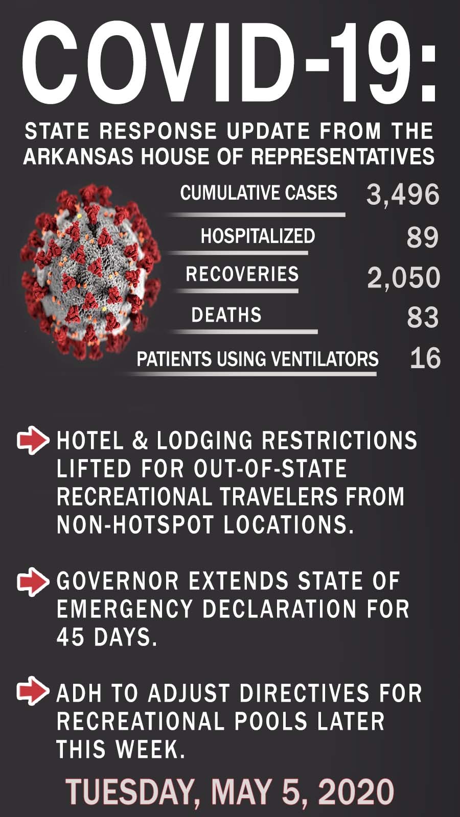 - Additional testing at the federal prison in Forrest City has resulted in an additional 94 inmates testing positive. Those cases are not yet added to the overall number of cases in the state. To date, 264 inmates at Forrest City and 876 inmates at Cummins have tested positive for COVID-19.