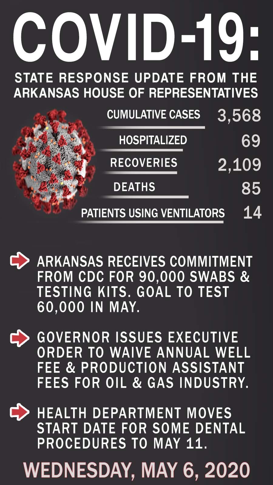 - The CDC has made a commitment to the Arkansas Department of Health to provide 90,000 swabs and testing kits this month. The goal to conduct 60,000 for the month of May.