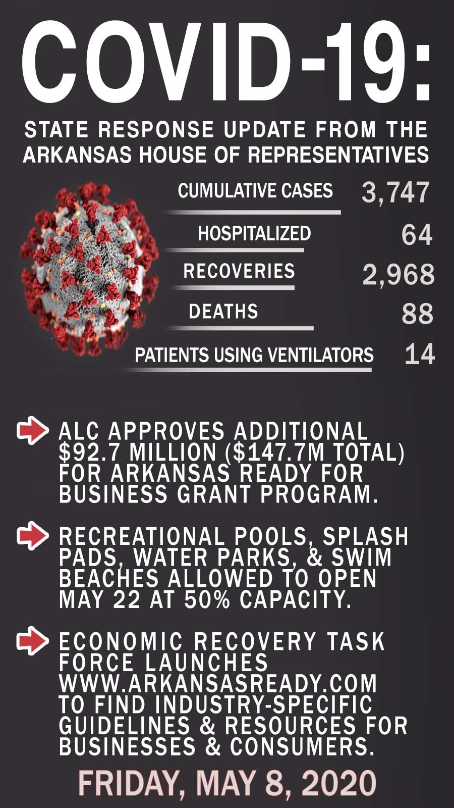 The Arkansas Legislative Council voted in favor of a motion this morning to direct an additional $92.7 Million from the CARES Act funding to the Arkansas Ready for Business Grant Program. The program received more than 12,000 applications during the enrollment period. The funding requests for businesses totaled $147.7 million. The vote for the funding is in addition to $55 million previously approved. The grants will be used for expenses associated with reconfiguring business to meet recommended health and safety guidelines such as PPE, cleaning supplies, and signs.