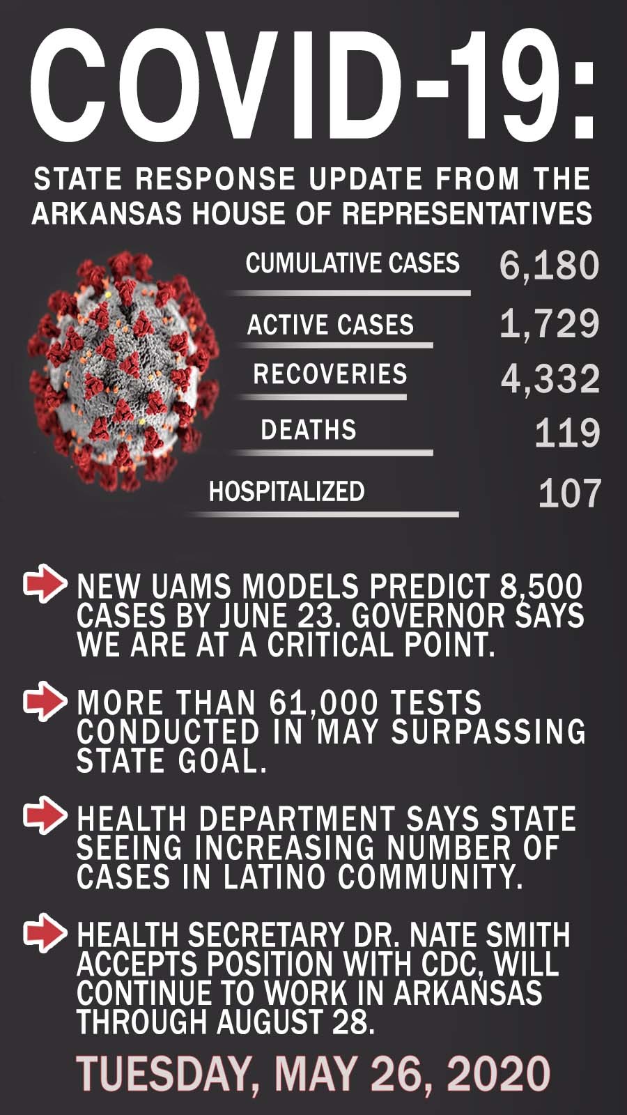 UAMS released new predictive models today showing the number of cumulative cases in the state could reach 8,500 by June 23. The Governor says we are now at a critical point. He added that the state cannot enter Phase 2 of re-opening the economy with an upward trajectory. He said the direction we go from here depends on the discipline of Arkansans.