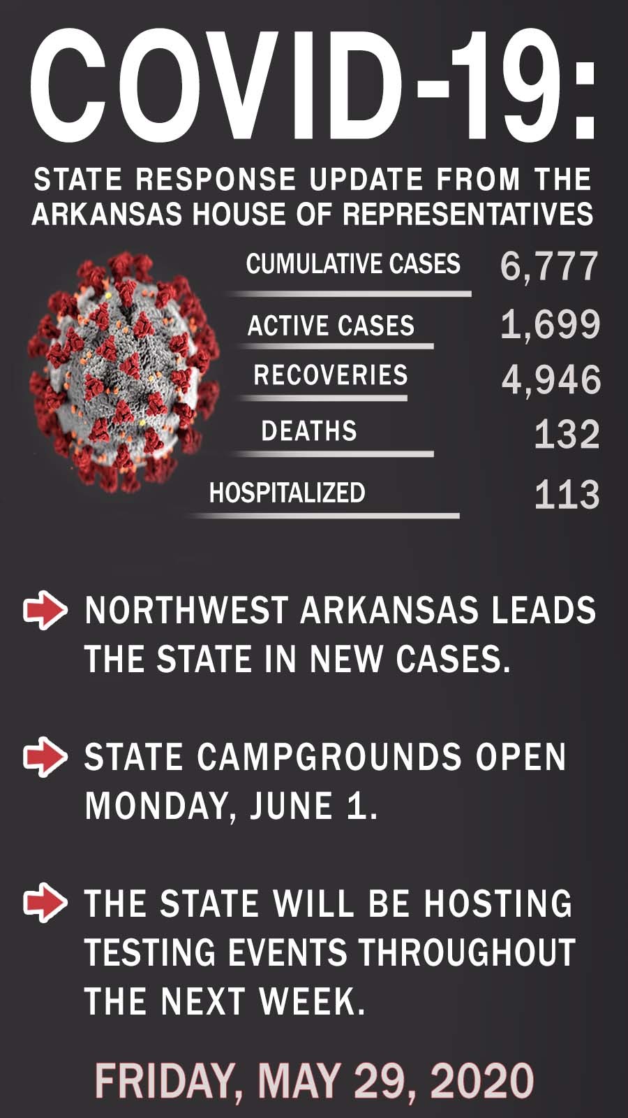 Secretary of Health Nate Smith noted that the state is hosting a number of important testing events, including an event in Dardanelle today from 3:00 PM to 7:00 PM. Their goal is to test 200 people. Tomorrow, testing events will be held in Fayetteville, West Memphis, De Queen, and Pine Bluff. Next Saturday, June 6, testing events will be held in Jonesboro, Wrightsville, and El Dorado. The goal is to test 500 people at each of these events.