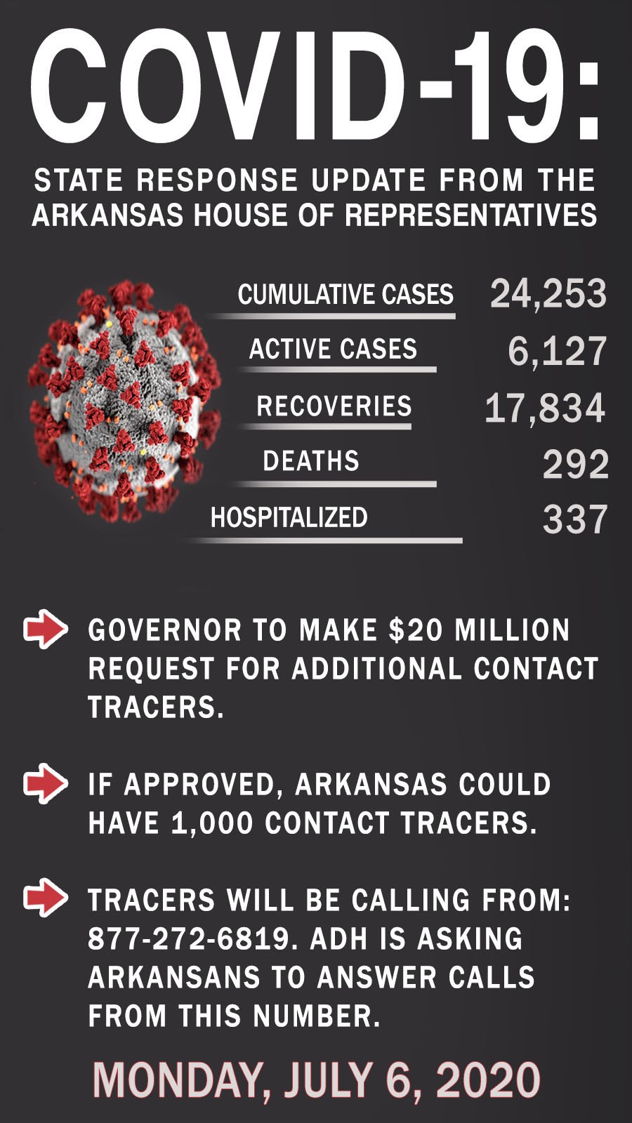 ADH is asking all Arkansans to answer if this number calls your phone. Tracers will be providing you with information about possible contacts and will NOT ask for money. If you are interested in working as a contact tracer, you are asked to apply at www.gdit.com
