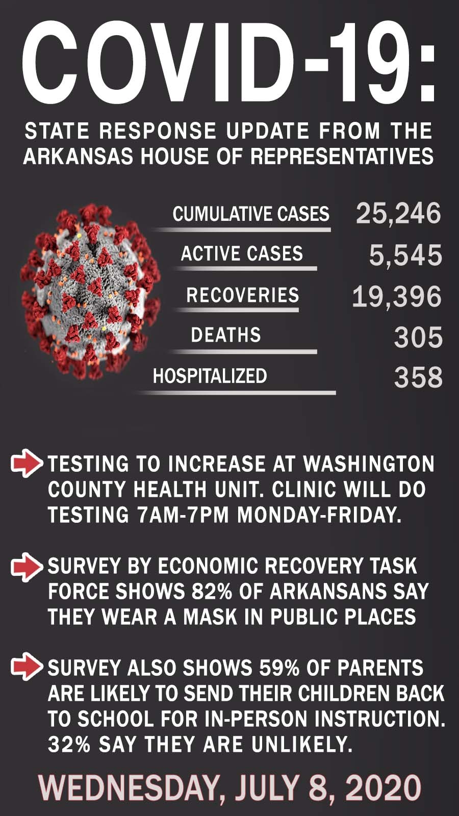 The Governor reminded those in Northwest Arkansas that Washington Regional is not the only testing location in Fayetteville. The local health unit is also doing testing from 7 am-7 pm Monday through Friday.
