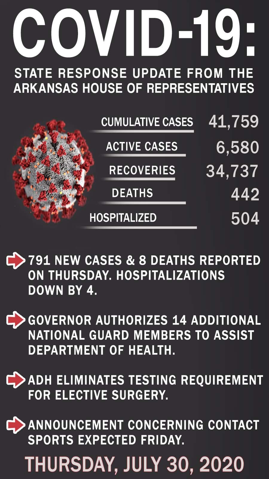 The Governor announced he is authorizing 14 additional members of the National Guard to assist the Arkansas Department of Health (ADH).