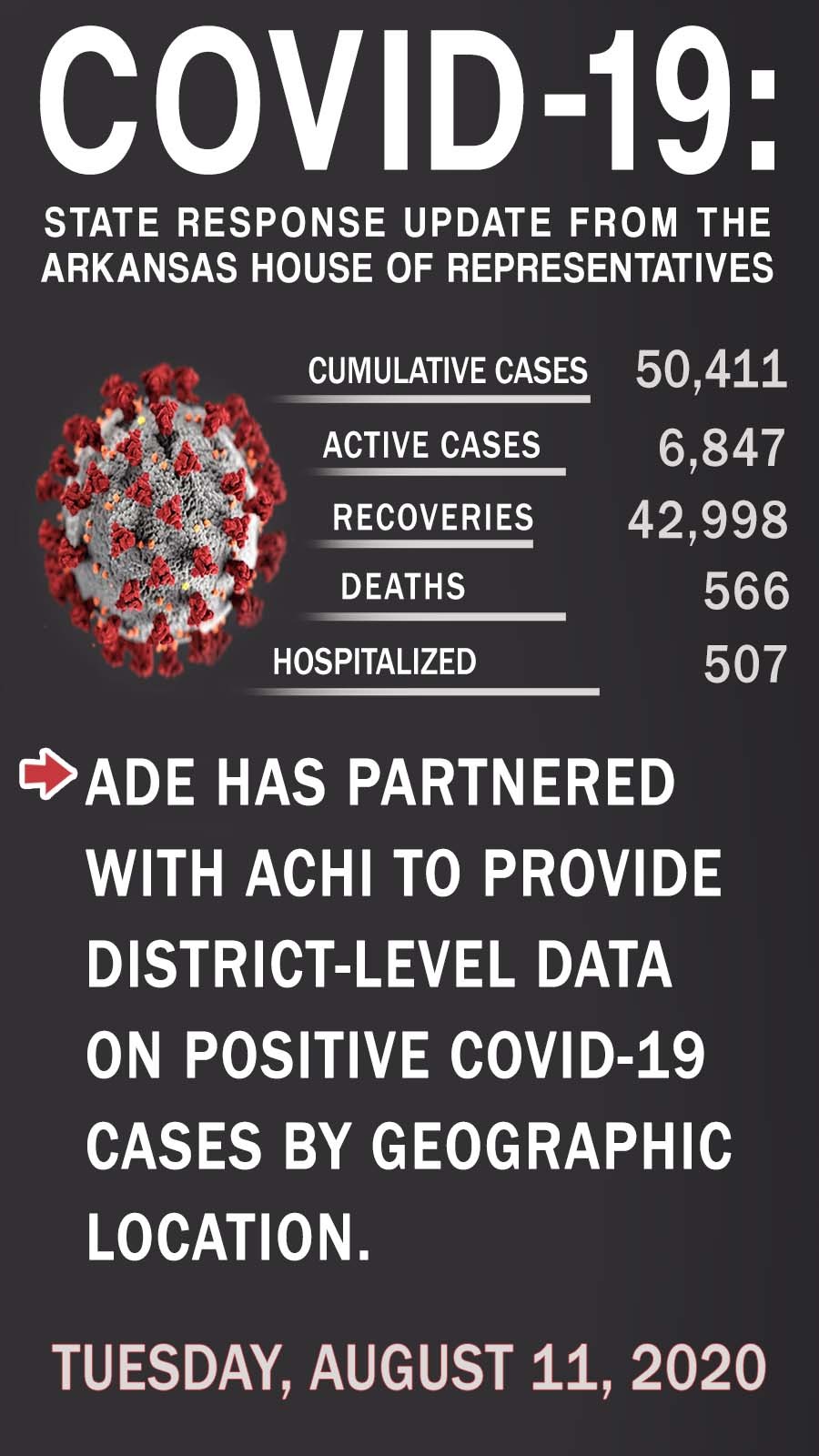Arkansas Department of Education (ADE) has partnered with Arkansas Center for Health Improvement (ACHI) to establish analytic surge capacity support to provide district-level data to include a weekly feed of positive COVID-19 cases by geographic location. Data points will include cumulative cases per school district, active cases per school district, and rates of testing assigned to the counties in that time period. ADE is looking at rolling it out sometime this week.