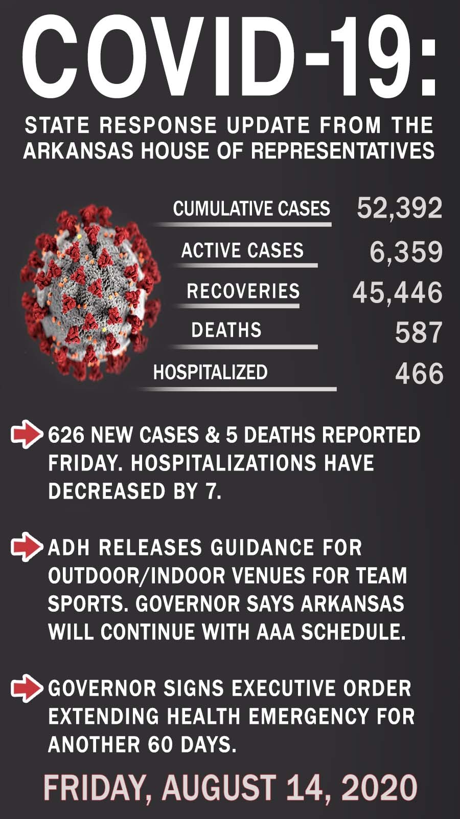 The Governor said school sports will continue with the Arkansas Activities Association schedule. The department of health has issued guidelines for indoor and outdoor venues for sporting events. The guidelines call for social distancing, use of masks, and limiting entry to 66% capacity.