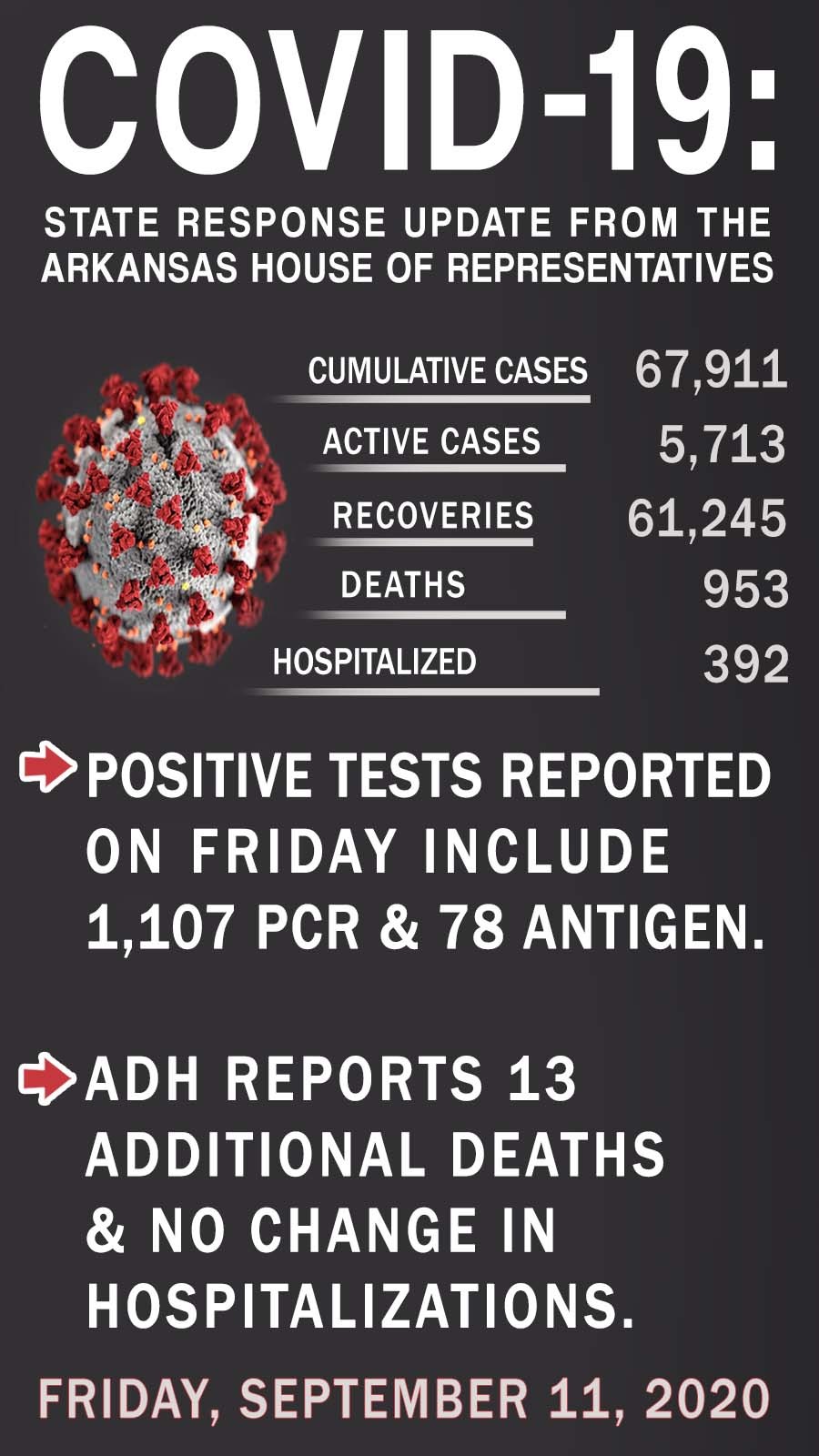 ADH reports 13 additional deaths. Hospitalizations have remained flat with no new hospitalizations.