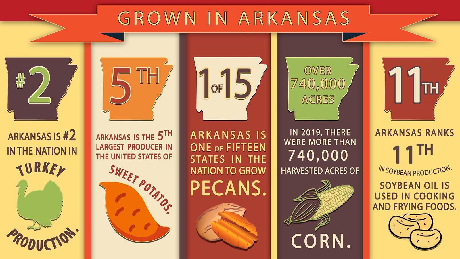 Arkansas is the 5th largest producer of sweet potatoes. And last year, Arkansas farmers harvested more than 740,000 acres of corn.