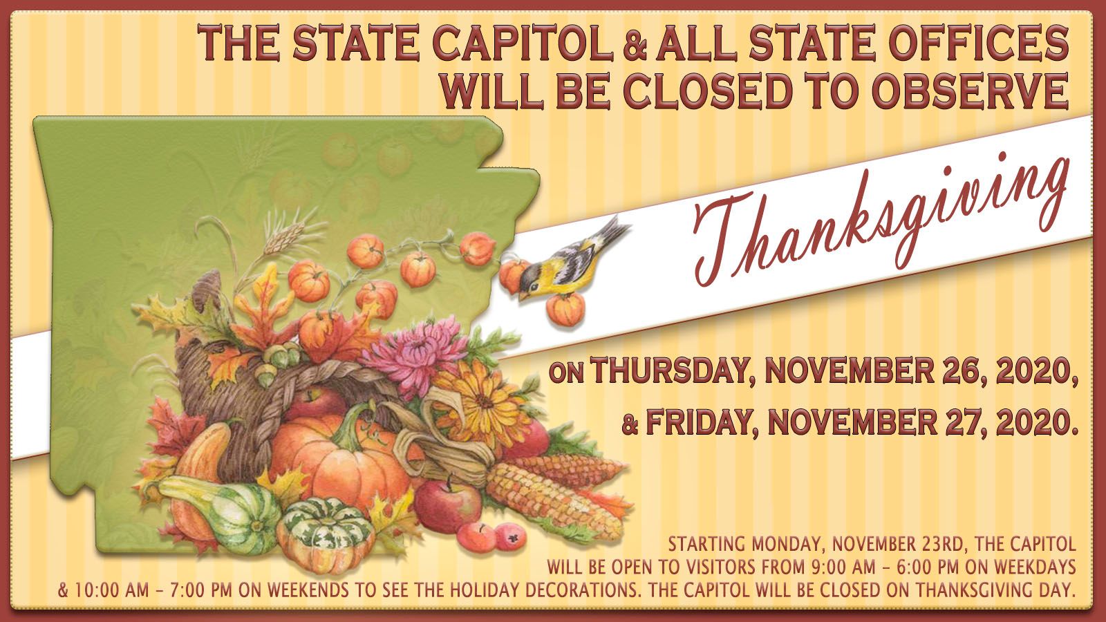 The State Capitol Offices and all State Buildings will be Closed to observe: Thanksgiving Thursday, November 26, 2020 (A legal holiday by authority of Act 304 of 2001 and amended by Act 561 of 2017), and Friday, November 27, 2020, By Governor’s Proclamation.