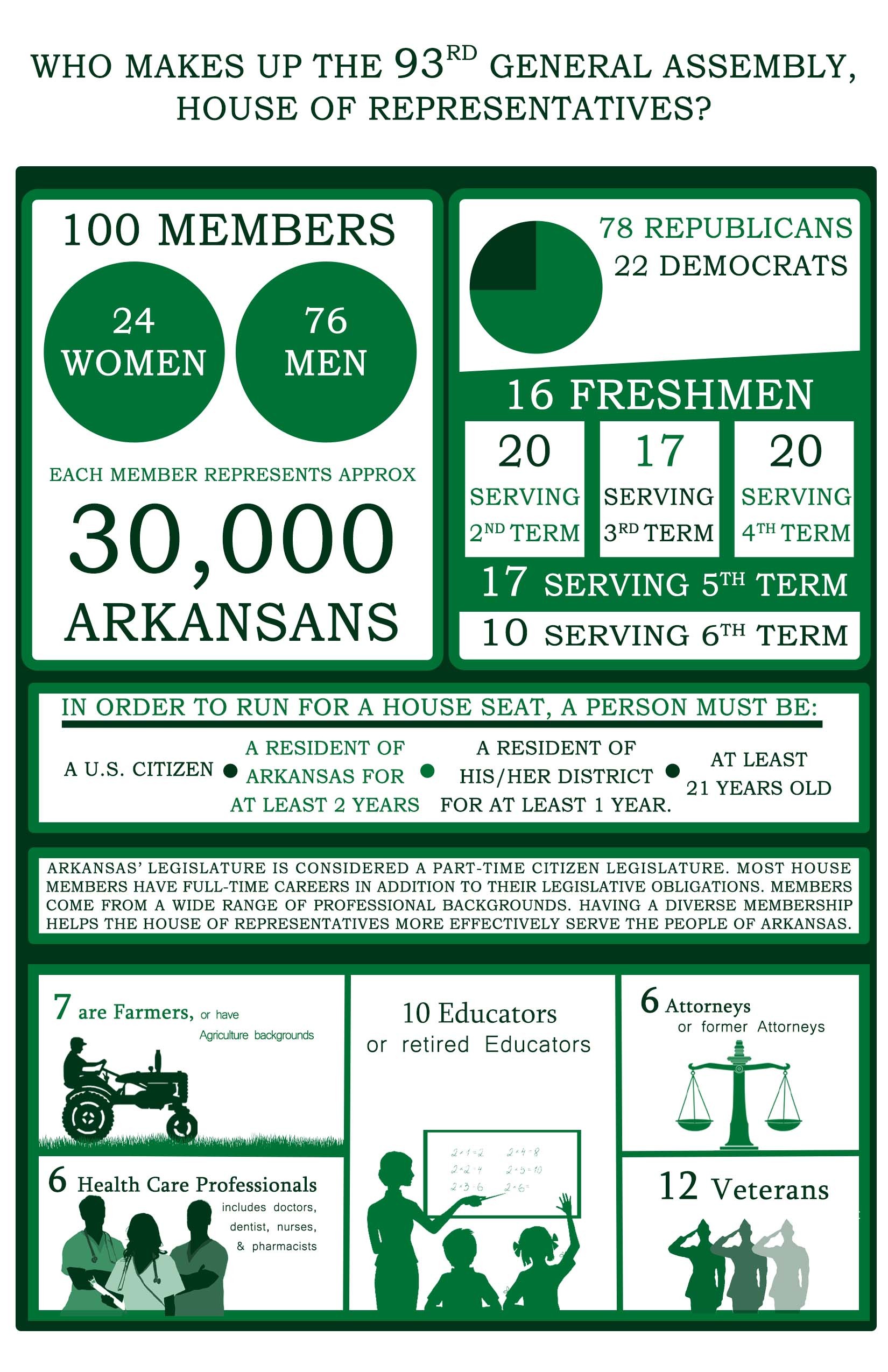 Arkansas’ legislature is considered a part-time citizen legislature. Most House members have a full-time career in addition to their legislative obligations. Members typically come from a wide range of professional backgrounds and the 93rd General Assembly is no exception.